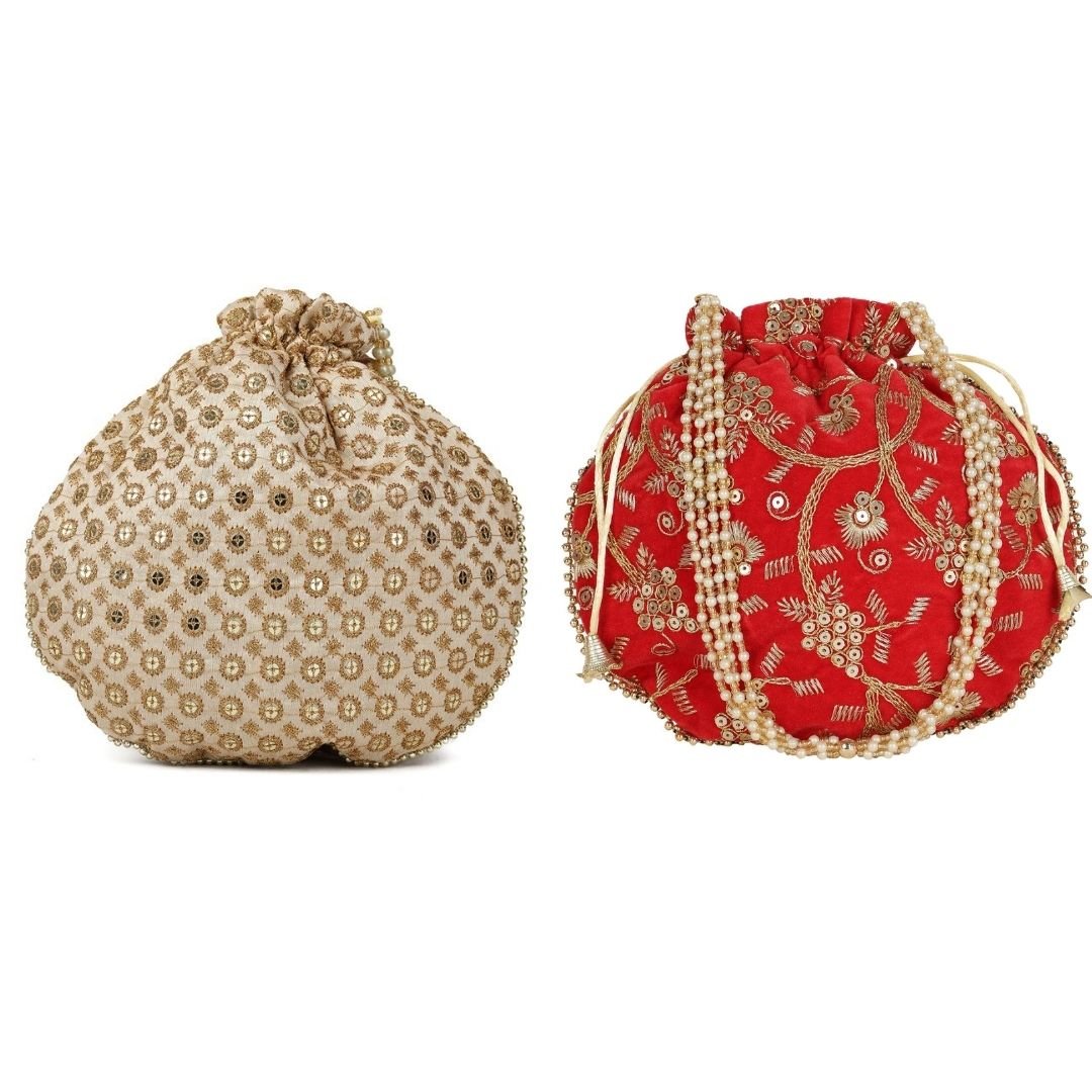 Combo – Designer Embroidered Potli Bag – Golden & Red