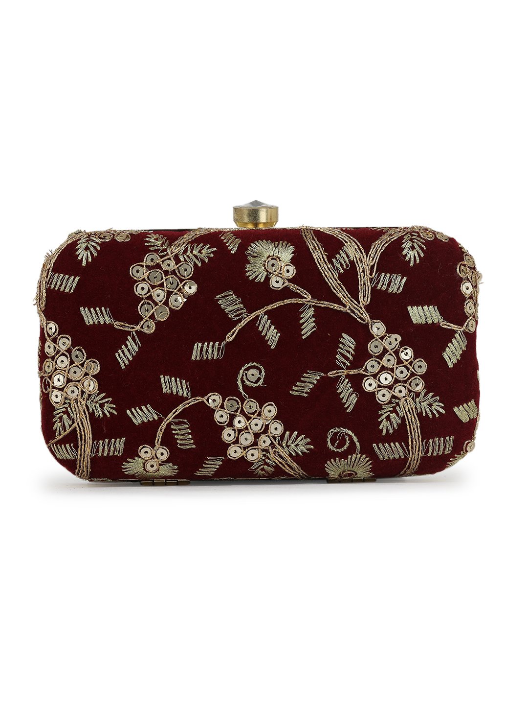 Maroon Embroidered Box clutches, Has gold chain shoulder strap, 1 main compartment with twist closure